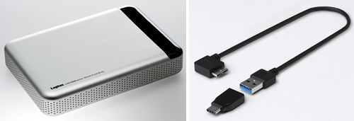 「LHD-PBMU3MSVシリーズ」(左)と、付属のUSBケーブルおよび変換コネクタ