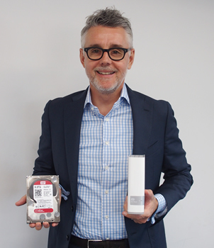 取材に答える米国WD社のスヴェン・ラスジェン WDネットワークコンテンツソリューションズ担当バイスプレジデント兼ジェネラルマネージャー。左手に「WD Cloud」を、右手に6TBモデルに内蔵しているHDD「WD Red Nas Hard Drive」を持っている
