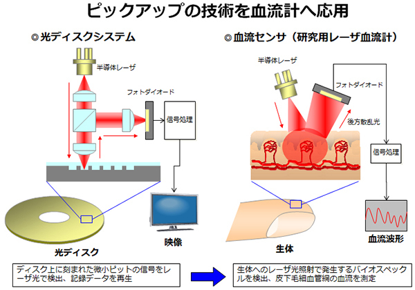 パイオニアが長年培ってきた光ディスクの読み取り技術を応用して自社開発した小型血流センサ素子を採用