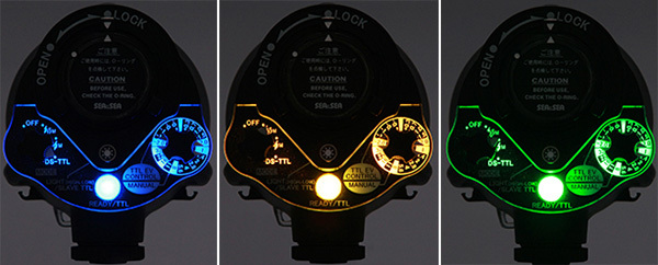 ナイトダイビングでの撮影時に抜群の効果を発揮する照光式操作パネルを採用。モードスイッチの位置を変えるたびに背面のインジケータ色が変化し、異なる色で識別することができるので、真っ暗な環境下でも操作系のポジショニングを確認できる。