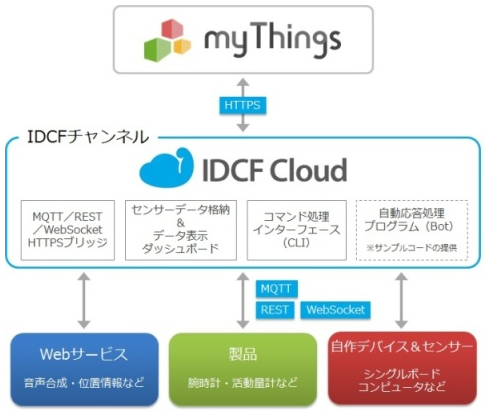 「myThingsプラットフォーム」は、各種デバイスやウェブサービスなどを接続して利用する、IoT分野の事業者向けプラットフォーム。IDCフロンティアは「IDCF」チャンネルを通じて、「myThingsプラットフォーム」やユーザー向けスマートフォンアプリ「myThings」と、自作のデバイスやウェブサービスとの接続・連携を可能にする、現時点で唯一の環境を提供する。