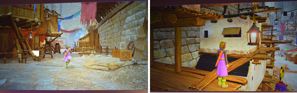 砂埃や風に揺れる旗などディティールをしっかり再現した街、(右)梯子や階段を登るとシームレスに上層と下層を移動できる