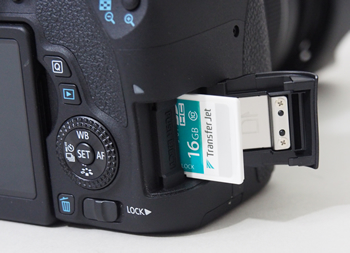 デジタルカメラにメモリカードを装着。利用したのはキヤノンの「EOS 8000D」