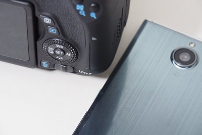 では早速、TransferJet搭載SDHCメモリカード「SD-TJA016G」を使ってみよう。今回はキヤノンのデジタル一眼レフカメラ「EOS 8000D」に「SD-TJA016G」を挿入した。TransferJetによるワイヤレス送信にカメラ側の初期設定は不要で、対応デバイスを受信状態にして近づけるだけで送信ができる。まずはスマホに送信してみよう。