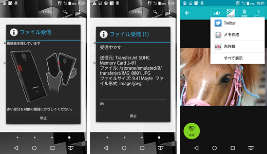 しかし、写真が趣味の方やこだわり派の方には、スマホで撮った写真では満足できない人が多い。スマホのカメラ性能は日々向上しているとはいえ、デジタルカメラと比べるとまだまだ、といった部分が多い。TransferJetによる送信はそういうこだわり派の人にお勧めだ。