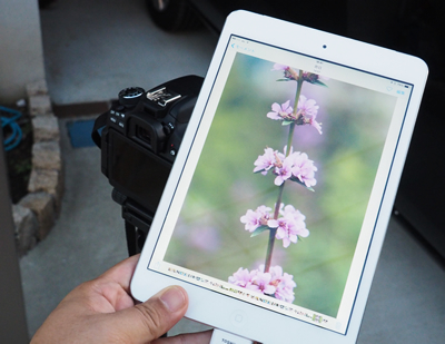 三脚に固定したカメラにiPad miniをかざして撮ったばかりの写真を受信