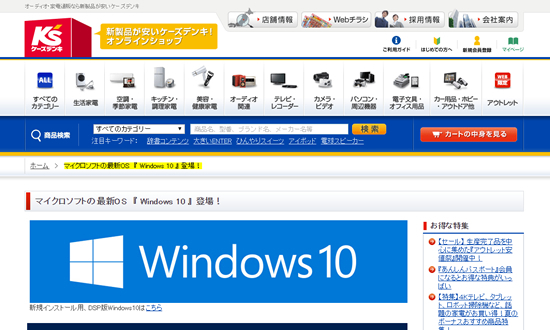 ケーズデンキのオンラインショップでもWiodws 10の無償アップグレードを訴求