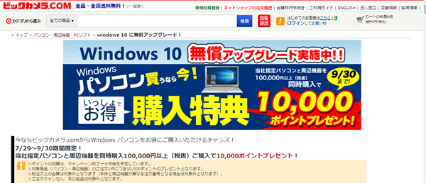 一方のビックカメラでは、無償アップグレードにからめて7月29日~9月30日の期間限定で、指定するパソコンと周辺機器で10万円以上(税別)を購入した顧客に対し、1万ポイントをプレゼントする販促キャンペーンを実施している。