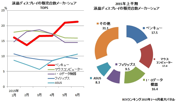 液晶ディスプレイ市場は現在、ベンキュージャパン、マウスコンピューター、アイ・オー・データ機器(I・Oデータ機器)の3社が激しいシェア争いを繰り広げている。月次の動きを見ると、その激しさがよくわかる。1月、2月はマウスコンピューター、3月はI・Oデータ機器、4~6月がベンキューとめまぐるしくトップが入れ替わるという、まさに激戦。その中で、2015年上半期(1~6月)の販売台数シェアで17.5%とNo.1を獲得したのがベンキューだ。2位はI・Oデータ機器で17.4%。0.1%の僅差でベンキューが逃げ切った。