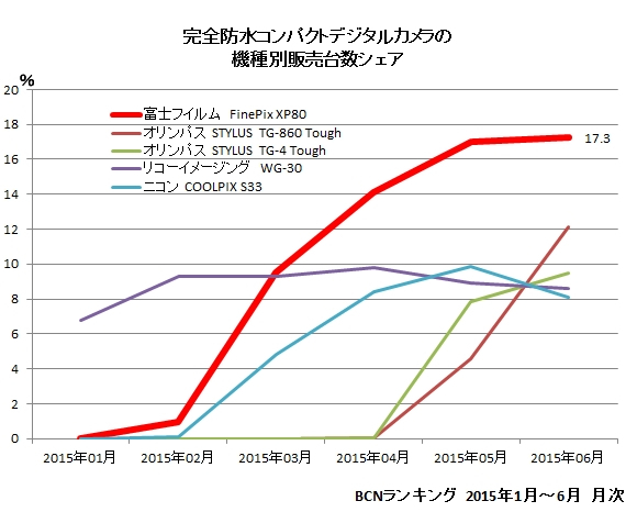 6月の防水デジカメトップシェアは富士フイルムの「XP80」、機能と価格のバランスの良さが奏功