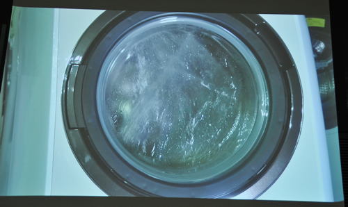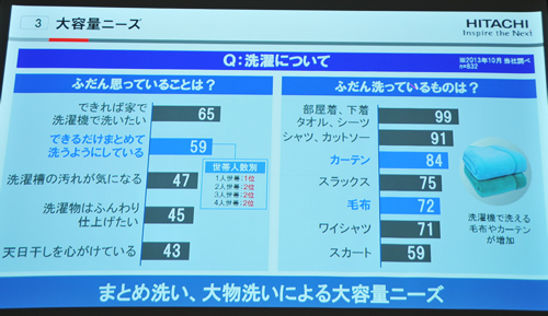 新商品では「大容量化」と「すすぎ」機能の強化が大きなポイント。大容量化については洗濯する際にユーザーが思っていることの2位に「できるだけまとめて洗うようにしている」(日立調べ)という項目に注目。世帯人数別でみても独身の1人世帯からファミリーの4人世帯まで幅広い世帯で1位や2位のトップ項目に入っていた。普段洗っているものは1位が「部屋着や下着、タオル、シーツ」、2位の「シャツ、カットソー」などに続き、「カーテン」が3位、「毛布」が5位に入った。洗濯できるカーテンや毛布が販売されていることから、比較的大きな洗濯物を普段から洗っている実態がうかがえる。まとめ洗いや大物洗いのニーズが、大容量化の開発をうながした。