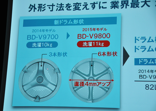 昨年モデルの「V9700」で採用していたドラムの硬性を保つための3本のスポークを、「V9800」では6本に増加。スポークの高さを、わずか8mmだけ低くした。このわずかな改善が、硬性を保ちつつもドラムの直径を従来よりも4mm長くすることにつながったのだ。ドラムの容積は82リットルから84リットルにアップし、洗濯・脱水容量が従来の10kgから1kgアップの11kgを実現した。シングル毛布ならまとめて2枚を洗える。