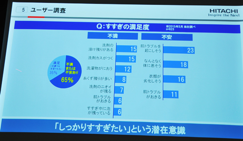 一方の「すすぎ」の満足度に関する日立の調査では、不満や不安を合わせて65%も満足していない実態が分かった。「洗剤の溶け残りがある」や「洗剤カスがつく」「洗濯物がにおう」という不満や、洗剤が残ることによる「肌トラブルを起こしそう」や「なんとなく体に悪そう」といった漠然とした不安を抱えていることが分かった。