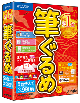ハガキ作成ソフト最新版「筆ぐるめ 23」(BOXパッケージ)。1ライセンスでPC5台までの利用に対応