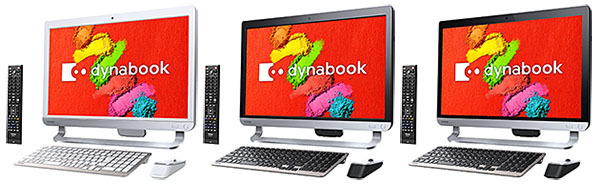 「dynabook D81」「dynabook D71」「dynabook D51」「dynabook D61」「dynabook D41」は、21.5インチのオールインワンデスクトップPC。Dシリーズは全機種がハイレゾ音源に対応している。9月18日から順次発売する。「dynabook D81」は、21.5インチのタッチ対応フルHDのIPS液晶ディスププレイ(解像度1920×1080)を搭載。CPUはインテルCore i7-4710MQを採用し、8GBのメモリ、3TBのHDD、BDXL対応BDドライブを搭載する。地上/BS/110°CSデジタルチューナー×2のWチューナー搭載。ボタンひとつでテレビがすぐに視聴できる「今スグTV」に対応する。価格はオープンで、税別の実勢価格は23万円台半ばの見込み。