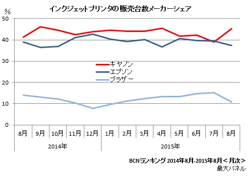 現在までのメーカー別販売動向を見ると、キヤノンとエプソンの2社で販売台数シェア8割前後を占める寡占状態が続いている。8月のシェアではキヤノンが45.2%とトップで、エプソンが37.3%と続いている。この2社に割って入ろうとしているのが、最後発のブラザーで、シェアは10.8%だ。年間シェア15%が目標としているが、2桁シェアが安定的に確保できるようになってきており、年末商戦の結果しだいでは、目標に手が届きそうだ。