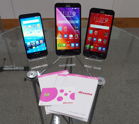 BIGLOBE SIMとBIGLOBEスマホ(左からSHARP AQUOS SH-M01、ASUS ZenFone2 ZE551ML、ASUS ZenFone2 Laser ZE500KL)
