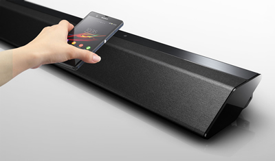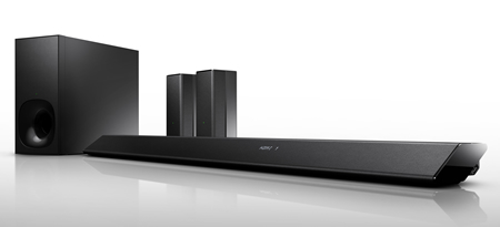 ホームシアターシステムの新製品は、省スペースで5.1chサラウンドを楽しめる「HT-RT5」。一般的な5.1chシステムだと、スピーカーとサブウーファーが合わせて7機器程度必要なのに対し、「HT-RT5」はバースピーカー/サブウーファー/リアスピーカー×2という少ない構成で広がりのある音を実現する。それぞれの電源を確保すれば、すべてがワイヤレスでつながるため、コードの煩わしさを大幅に解消することができる。
