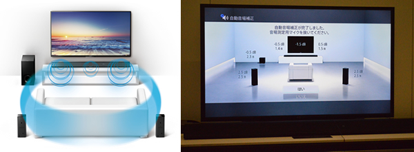 (左)各スピーカーから音が広がるイメージ(右)自動音場補正機能「D.C.A.C.DX」の実行画面