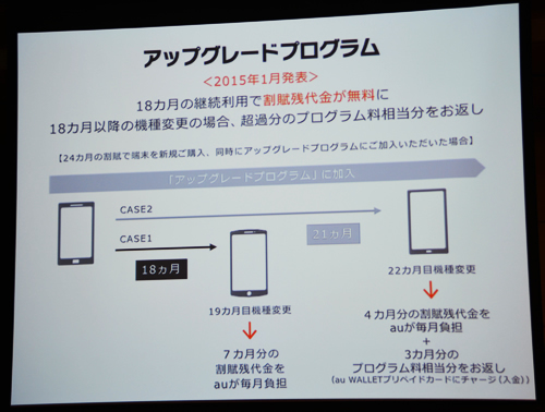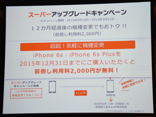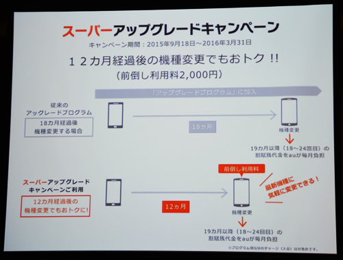 KDDIと沖縄セルラーは、2015年2月6日から提供している「アップグレードプログラム」を拡大し、機種変更できる期間を従来の18か月間から12か月間に短縮した新プログラム「スーパーアップグレードキャンペーン」を9月18日から開始する。