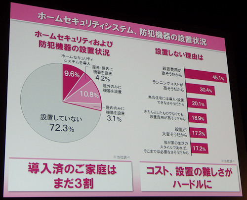 商品ラインアップはBCNランキングで既報のとおりだが、注目したいのは価格だ。屋内カメラとホームユニットのセットで税別の実勢価格は2万6000円前後。屋外カメラは、1台あたり1万8000円前後で追加できる。また人感センサー(4000円前後)やドア開閉センサー(4500円前後)も追加できる。手ごろな価格と簡単な設置で、普及を後押ししできるかが、今後、事業を拡大する上で試金石となる。屋内外の様子はスマートフォン(スマホ)で外から確認できるなど、セキュリティ会社のサービスとひと味違う。