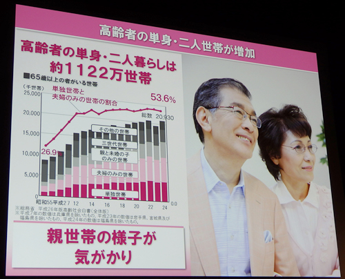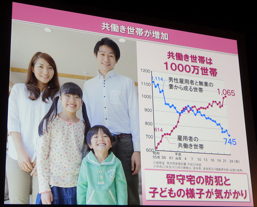 市場環境も防犯や見守りサービスを後押しする。女性の社会進出が増えて2012年の全国の共働き世帯は1000万世帯を超えた。年々増えつづけている。また、65歳以上の人がいる世帯2093万世帯のうち、高齢者の単身や二人暮らしは約1122万世帯で53.6%と半数を超えている(いずれも12年の総務省調べ)。