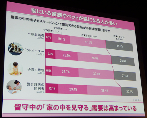 同社が実施した「家の中の様子をスマートフォンで確認したい機器があれば設置しますか」というアンケートでは、ペットオーナーの7割以上が設置に前向きであることが分かった。一般生活者や子育て中の母親、要介護者の同居者のいずれにおいても7~8割と、潜在ニーズの高さがうかがえる。