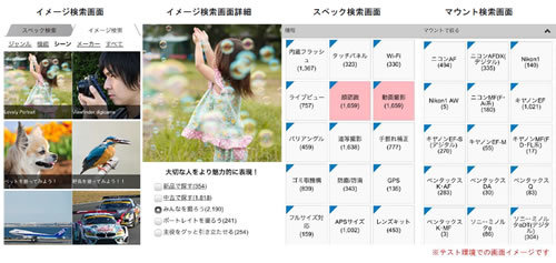 PC用サイトで使われている「こだわり検索」機能をスマホ用サイトにも展開。新しい検索画面は「イメージ検索」と「スペック検索」から構成されている。 「イメージ検索」では、「憧れのプロ仕様カメラ」のジャンルや「ペットを撮ってみよう!」などのシーン、「マクロレンズを楽しむ」といった機能やメーカー から新品や中古のカメラを検索できる。「スペック検索」では、レンズマウントやファインダー形式、記録メディア、ボディカラー、焦点距離、開放F値、有効画素数、重量、最高シャッタースピード、最大連続撮影、液晶サイズの複合条件から検索して絞り込める。