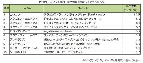 PCゲームソフト部門の製品別ランキングで8月販売本数シェアNo.1を獲得