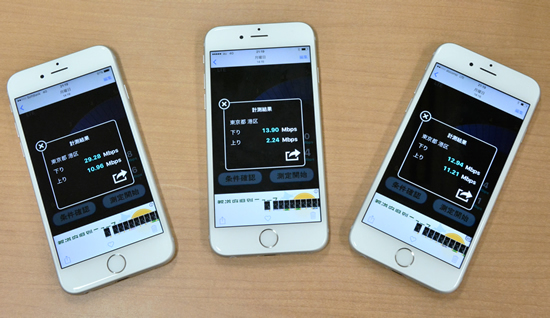 左からソフトバンク、au、ドコモのiPhone 6s(計測結果は新橋駅)
