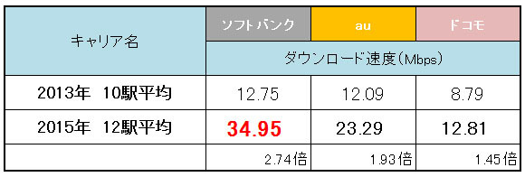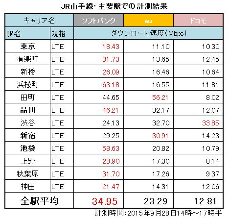 計測した12駅のうち、東京、有楽町、新橋、浜松町、品川、池袋、上野、秋葉原、神田の9駅でソフトバンクのiPhone 6sが最も速く、最速駅の数ではソフトバンクがほかの2キャリアを圧倒した。12駅の通信速度の平均値も、ソフトバンクが34.95Mbps、auが 23.29Mbps、ドコモが12.81Mbpsで、ソフトバンクが最速だった。