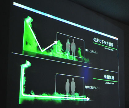 新商品は、エアコン本体の気流を壁と床に沿って送る「垂直気流」を実現した。従来は温風が床に当たって跳ね返って、人に当たっていたが、壁伝いに垂直に送られる気流がそのまま床を伝う。風が椅子やソファなどの下を通って、足元から部屋全体を暖める。風速は従来の1.2m/sから0.3m/s以下にした。壁から1m以上、床上30cm以上のエリアで風を感じないほど、やさしく流れるという。