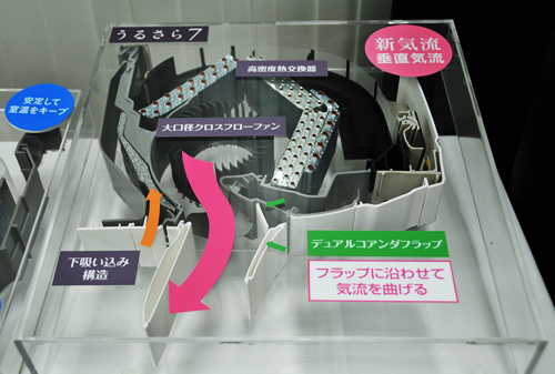 本体の上から吸い込んだ空気が熱交換器で暖気になり、新開発「デュアルコアンダフラップ」を通じて壁を沿って垂直に床に落ちていく。「デュアルコアンダフラップ」は壁面に向かって反り返る補助フラップと、本体内部の風向板の二つからできている。