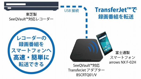 今後、発売を予定する東芝のBlu-rayレコーダーから、TransferJetで富士通のスマートフォン「arrows NX F-02H」へ録画番組を持ち出せる。