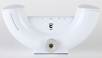音楽を奏でる40mm径のスピーカーは出力5W×2。3.5mmステレオミニの外部入力を備え、内蔵の音楽だけでなくスマートフォンなどを接続して音楽を再生できる。電源はmicroUSB端子を使用。本体大きさは幅250×奥行き72×高さ120mm。重さは532g。香りの異なる三つのアロマを付属する。