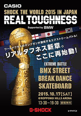 カシオ計算機は、「G-SHOCK」の名を冠したストリートスポーツ系イベント「G-SHOCK SHOCK THE WORLD 2015 IN JAPAN REAL TOUGHNESS Supported by BMW」を10月17日に六本木ヒルズアリーナ(東京都港区)で開催する。入場は無料。開場は13時30分で、19時30分に終了予定。