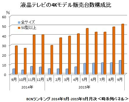 4Kテレビの販売がじりじりと伸びている。9月には液晶テレビの販売台数の14.1%を占めるまでに拡大。50型以上の大型モデルに限ると、4Kテレビは51.7%と半数を超え、9月に販売された大型液晶テレビの2台に1台は4Kという状況になった。