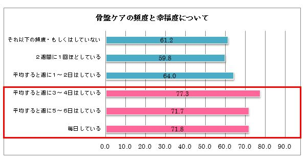 女性に対して行った幸福度に関する質問では、平均点が100点満点で62.1点だった。一方、骨盤ケアの頻度との関連では、普段から骨盤ケアを行ってい る「コシコシ女子」の方が幸福度が高く、骨盤ケアの頻度が週2回以下の人の幸福度が平均で65点を下回ったのに対して、骨盤を週に3回以上ケアしている人 の平均点は70点を超えている。