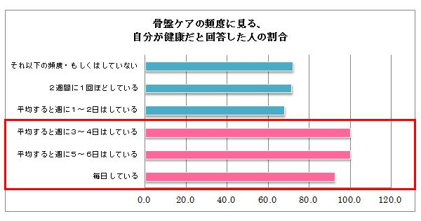 体調に関する質問では、骨盤ケアの頻度が週2回以下の人は、3割近くが「体調がよくない」と答える一方で、骨盤ケアの頻度が週3回以上の人の9割が、自分を健康であると答えており、骨盤ケアと体調との関連がうかがえる。