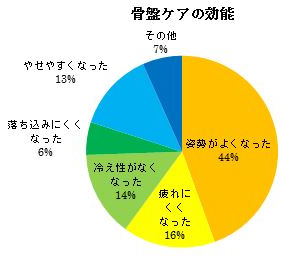 骨盤ケアの効果に関する質問では、44%の人が「姿勢がよくなった」、16%の人が「疲れにくくなった」と答えており、「冷え症がなくなった」 (14%)、「やせやすくなった」(13%)、「落ち込みにくくなった」(6%)が続き、骨盤ケアによって血流や代謝が向上した結果、このような効果を感 じる人が多いのではないかと考えられる。
