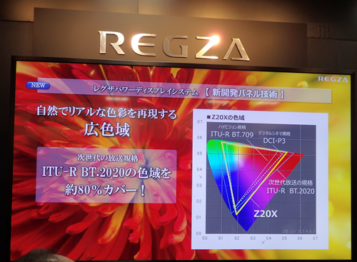 パネル技術では、バックライトと外光の拡散反射を低減するクリアな「ハイコントラストブラックパネル」を新開発。次世代の放送規格であるITU-R BT.2020の色域を約80%カバーする色彩の再現性を持つ。