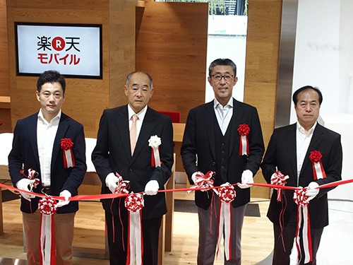 「楽天モバイル 銀座店」のテープカット。左から、楽天の大尾嘉宏人 楽天モバイル事業長執行役員、数寄屋橋ショッピングセンターの柳澤眞人 代表取締役社長、楽天の平井康文 代表取締役副社長執行役員、フュージョン・コミュニケーションズの池口正剛 代表取締役社長