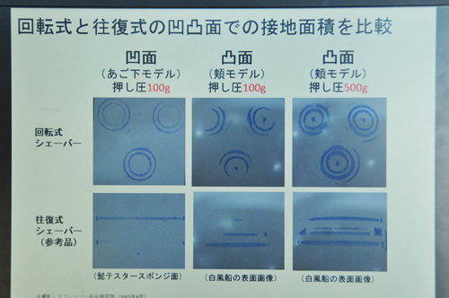 フィリップスでは、凹凸面に対して、「回転式」は押し圧が小さくても接地面積が広いことを実験データを使いながら視覚的にも分かりやすく説明している。