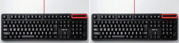 キートップは指の動きに合わせたラウンド形状で、軸受けには滑りやすく摩耗に強いPOM(ポリアセタール)樹脂製のリングを搭載。ガタつきを抑え、なめらかなキー押下を実現した。キー配列は日本語108キー、キーピッチは19mm、キースイッチはメンブレン方式。主要24キーがキーロールオーバーに対応しており、最大12キーまでの同時押しに対応する。また、手ざわりがよく、断線しにくい布ケーブルを採用した。