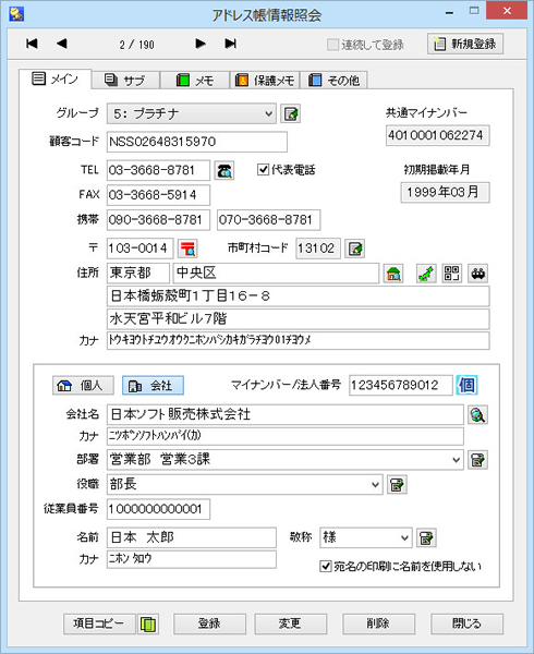 各種検索・辞書機能(郵便番号検索、住所検索、姓名辞書)を搭載し、顧客登録作業を正確かつスピーディーにサポートする。検索したデータはアドレス帳に 登録・管理し、連携ソフトを使った地図表示や各種印刷(はがき/封筒/ラベル/名刺/一覧表)に活用できるので、マーケティング活動を効率化できる。最新 版ではマイナンバーに対応し、企業の重要な情報を一元管理できる。
