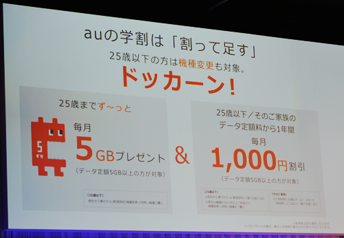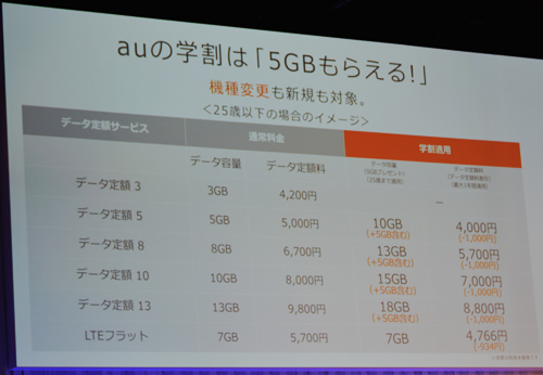 KDDI(au)は1月12日、2016年auの学割キャンペーンを発表した。26歳の誕生月まで毎月5GBのデータ容量をプレゼントするほか、学生だ けではなく家族のデータ定額料金から最大1年間1000円割り引く。キャンペーン申込期間は1月14日から5月31日まで。
