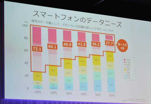 では、学生が魅力的だと感じるサービスとは何だろうか。田中社長は、さらにアンケート結果を示しながら、「10代は72.1%、20代は60.1%の ユーザーが1か月で8~15GBの通信容量を求めている、という結果が出た。若者は動画を視聴することが多く、毎月データをたくさん使っている。月末には 通信制限がかかってしまう、Wi-Fiを利用してデータをなるべく使わないようにしているなど、スマホの利用に不自由を感じている」と話した。