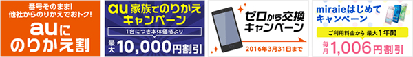 KDDIと沖縄セルラーは1月14日、「au」の2016年春キャンペーンとして、他社からの乗り換えがおトクな「auにのりかえ割」、家族でおトクな 「au家族でのりかえキャンペーン」、機種変更時におトクな「ゼロから交換キャンペーン」、ジュニア向けスマートフォンを対象にした「miraieはじめ てキャンペーン」を開始した。