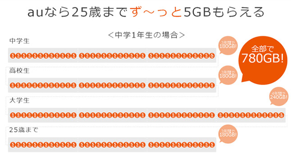 「2016年 auの学割」は、25歳以下でMNPを含む新規契約、または機種変更時に「データ定額5/8/10/13」を契約したユーザーを対象に、26歳の誕生月ま でデータ容量を毎月5GBプレゼントするキャンペーン。たとえば、中学1年生で学割に加入した場合は、合計156か月間、計780GBがもらえる。