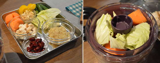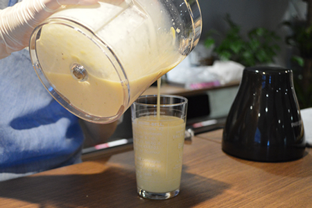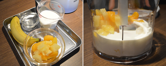 (左)ミックスジュースの食材(右)カップに食材をすべて投入する
